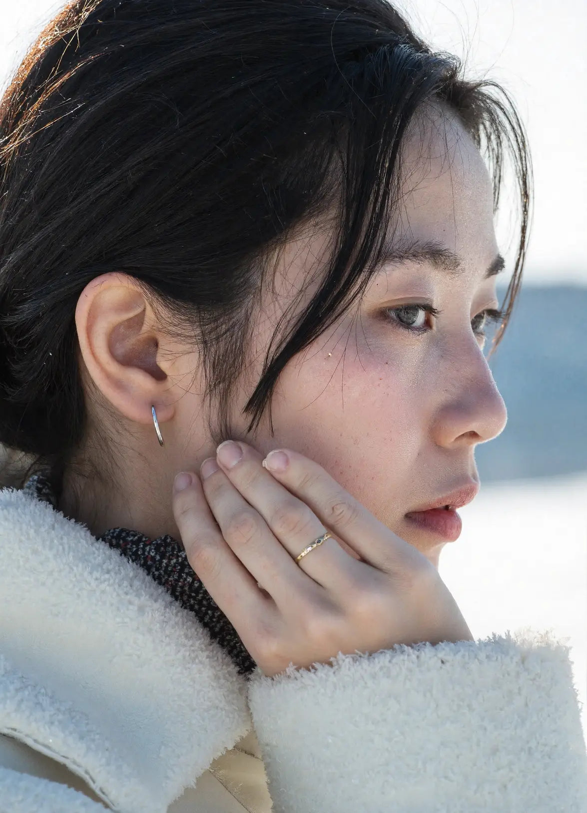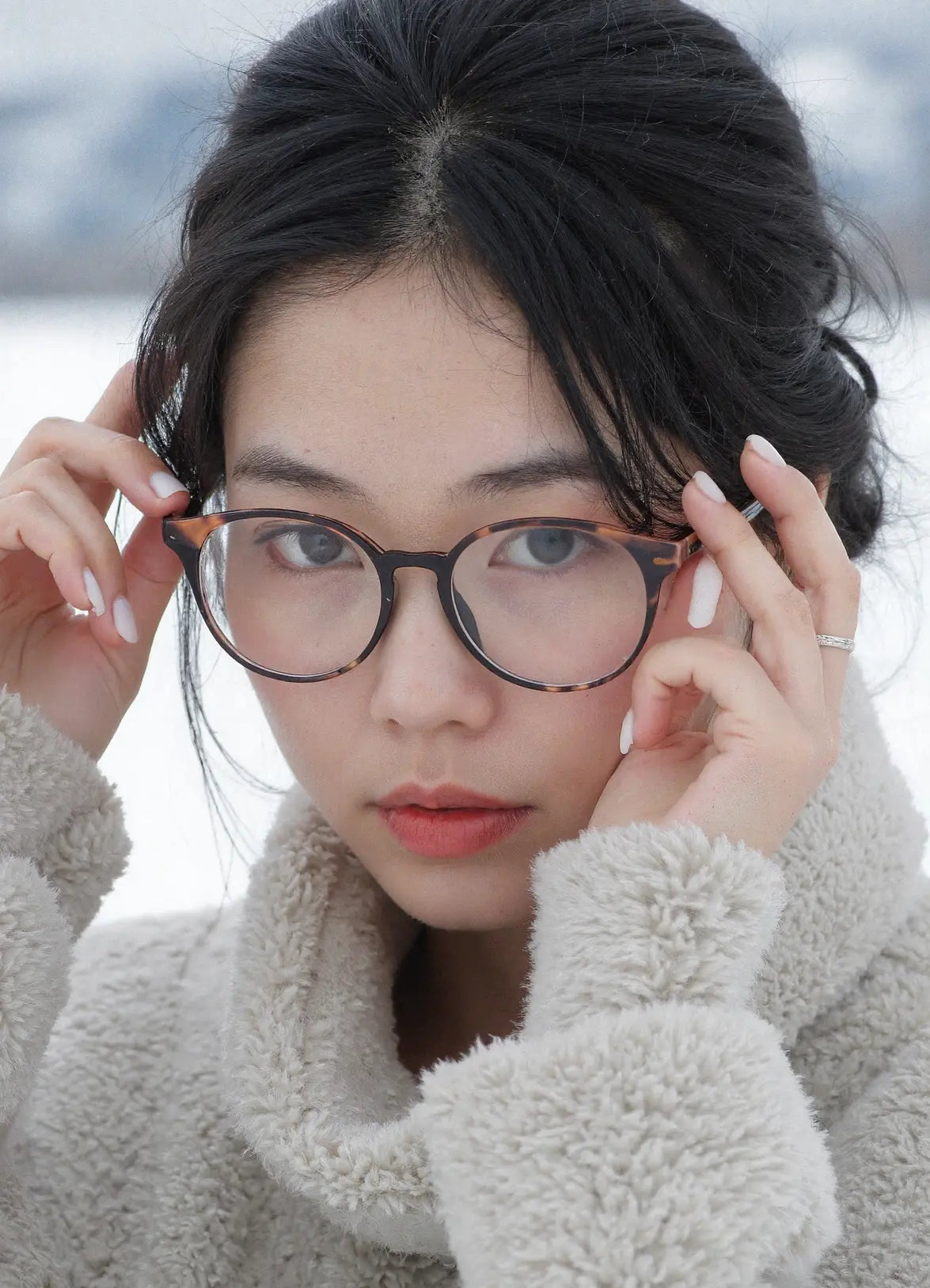 Woman in a white fluffy coat and green bag standing in a snowy landscape